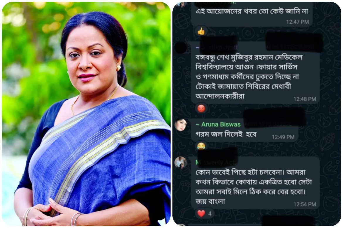 আওয়ামী লীগের সাবেক তথ্যপ্রতিমন্ত্রী এ আরাফাত ও সাংসদ ফেরদৌসের নেতৃত্বে ‘আলো আসবেই’ নামক একটি হোয়াটসঅ্যাপ গ্রুপের কিছু স্ক্রিনশট মঙ্গলবার সকালে সোশ্যালে ভাইরাল হয়। সেখানে দেখা যায়, অভিনেত্রী অরুণা বিশ্বাস, সোহানা সাবাকে যাদের অবস্থান ছিল ছাত্রদের আন্দোলনের বিপক্ষে! তারা মত দেন যেভাবেই হোক আন্দোলন থামাতে হবে। অরুণা বিশ্বাস সরাসরি পরামর্শ দেন ছাত্রদের ওপর গরম পানি ফেলার।