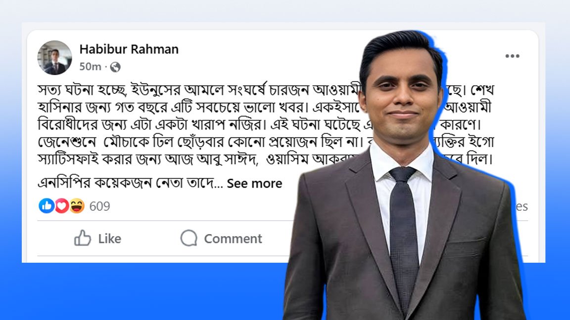পোস্টে হাবিবুর রহমান দাবি করেন, সংঘর্ষে আওয়ামী লীগের চারজন কর্মী নিহত হয়েছে, এবং এটিই ছিল শেখ হাসিনার সরকারের জন্য গত বছরের “সবচেয়ে ভালো খবর”। তার মতে, এই ঘটনা শুধু সরকার নয়, বিরোধী রাজনীতির পক্ষেও একটি “খারাপ নজির” তৈরি করেছে। আইনজীবী হাবিব বলেন, পুরো ঘটনার কোনো প্রয়োজন ছিল না, এটি ঘটেছে “কয়েকজন ব্যক্তির ইগো স্যাটিসফাই” করতে গিয়ে।