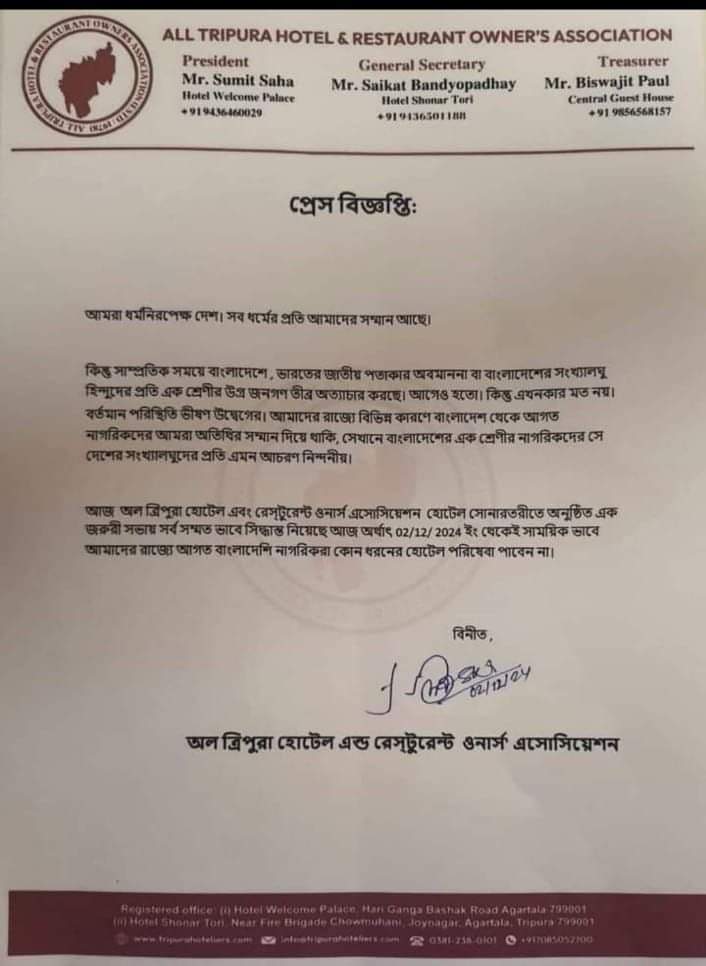হোটেল মালিকরা জানিয়েছেন, সাম্প্রতিক কিছু ঘটনার প্রেক্ষিতে তারা এ পদক্ষেপ নিতে বাধ্য হয়েছেন। স্থানীয় সময় ২ ডিসেম্বর, রবিবার, ত্রিপুরা হোটেল অ্যাসোসিয়েশনের জরুরি সভায় এ সিদ্ধান্ত নেওয়া হয়। ভারতীয় সংবাদমাধ্যমে এই তথ্য প্রকাশ করা হয়েছে।