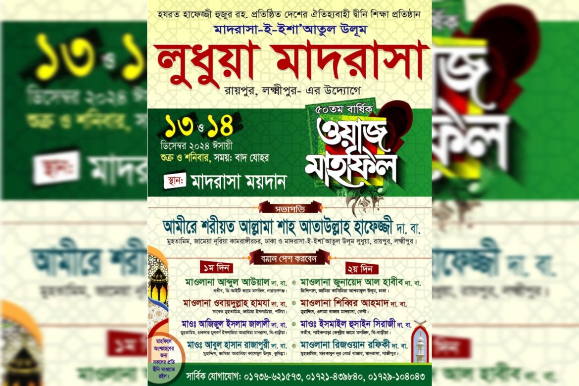 লক্ষ্মীপুর জেলার রায়পুরে অবস্থিত ঐতিহ্যবাহী ধর্মীয় শিক্ষা প্রতিষ্ঠান, হযরত হাফেজ্জী হুজুর রহ. প্রতিষ্ঠিত মাদ্রাসা-ই-ইশা’আতুল উলুম লুধুয়ার উদ্যোগে আগামী ১৩ ও ১৪ ডিসেম্বর ৫০তম বার্ষিক ওয়াজ মাহফিল অনুষ্ঠিত হতে যাচ্ছে।
