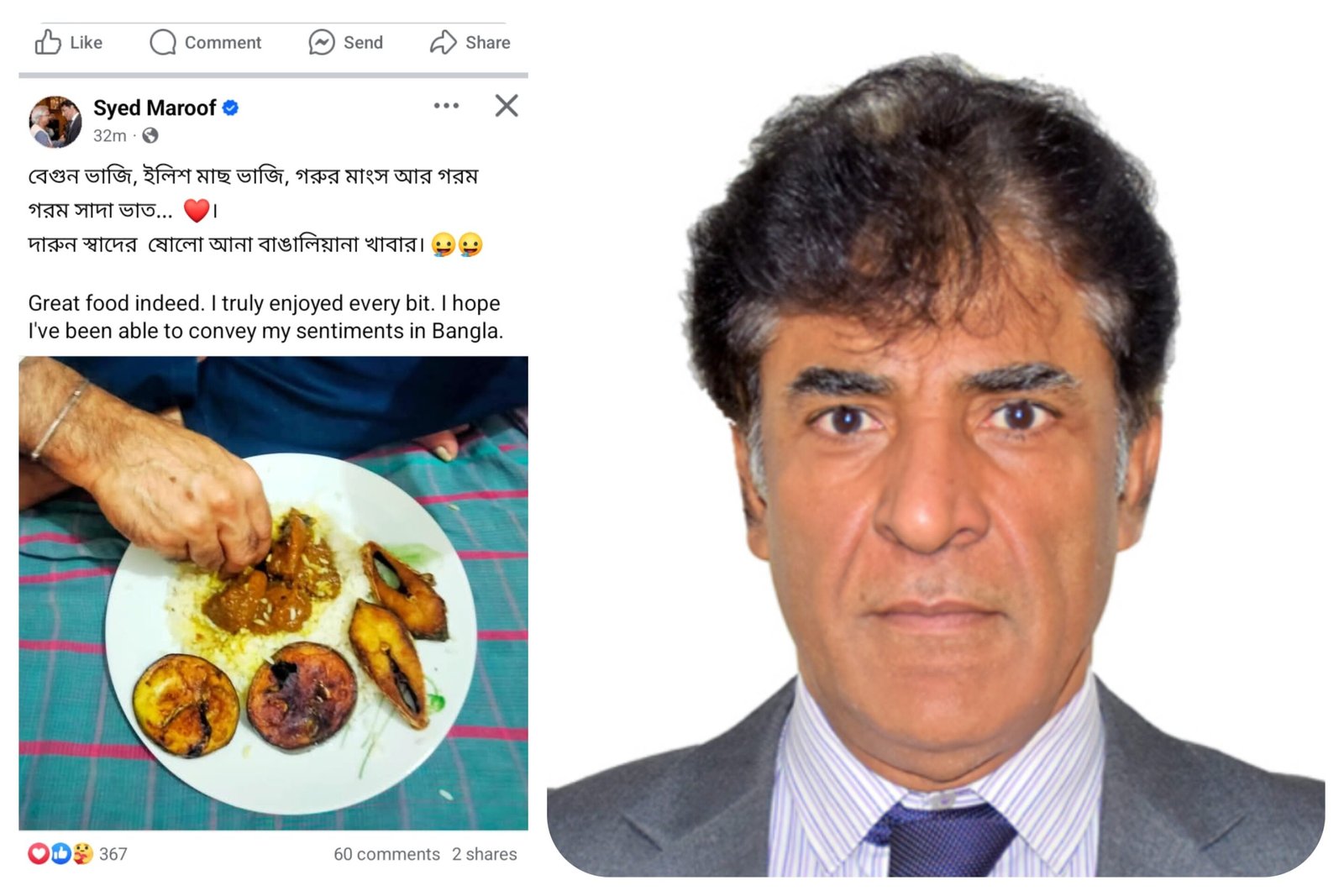 ঢাকায় নিযুক্ত পাকিস্তানের হাইকমিশনার সৈয়দ মারুফ সম্প্রতি ফেসবুকে বাঙালিয়ানা খাবারের প্রতি তার ভালোবাসা প্রকাশ করে একটি পোস্ট দিয়েছেন। ছবিতে দেখা যায়, গরম ভাত, ইলিশ মাছ ভাজি, গরুর মাংস এবং বেগুন ভাজি পরিবেশিত হয়েছে। তিনি পোস্টে লিখেছেন, “দারুণ স্বাদের মোহে আনানো বাঙালিয়ানা খাবার।”